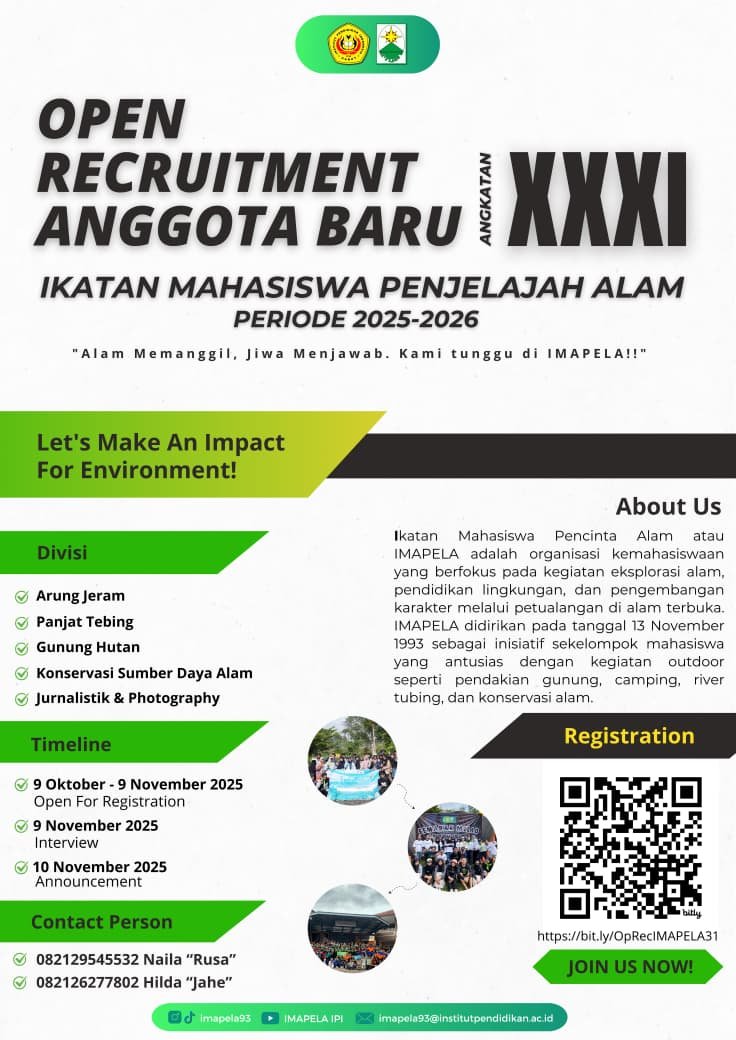 Dengan salam kebanggaan “Salam Lestari!”, IMAPELA IPI Garut mengundang seluruh mahasiswa untuk bergabung, menjawab panggilan alam, serta berkontribusi nyata bagi kelestarian lingkungan.